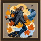 A figure in a black coat stands by a lake, surrounded by autumn leaves. Dark clouds loom overhead, while a crow flies against a backdrop of vibrant fall colors and a serene reflection in the water.