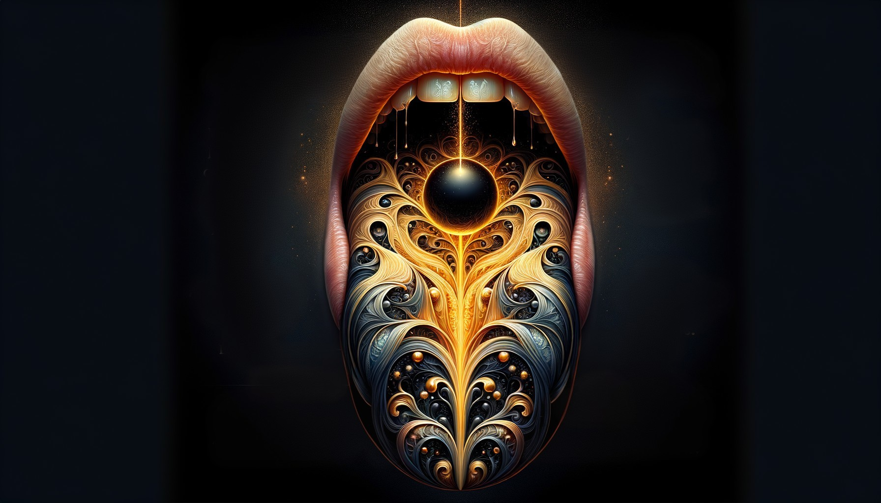 The image features a surreal, ornate mouth with intricate patterns and a glowing orb at its center, blending elements of geometry and organic forms in a dark, mystical backdrop.