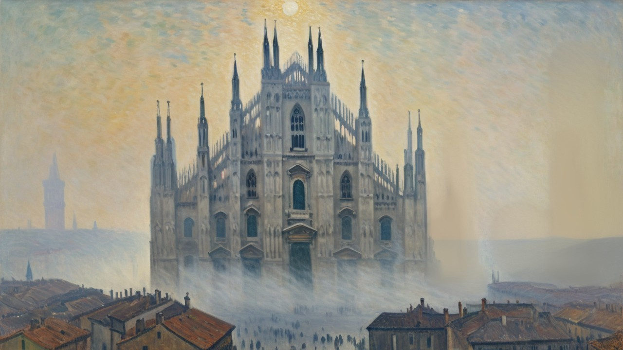 The Milan cathedral rises majestically against a pastel sky, enveloped in light fog. Nearby rooftops peek through the fog, while crowds gather below, creating an ethereal atmosphere.