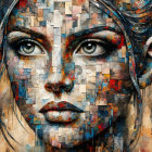 The image features a striking portrait of a woman, her face artistically composed of abstract geometric patterns and textures, blending warm and cool colors for a dynamic visual effect.