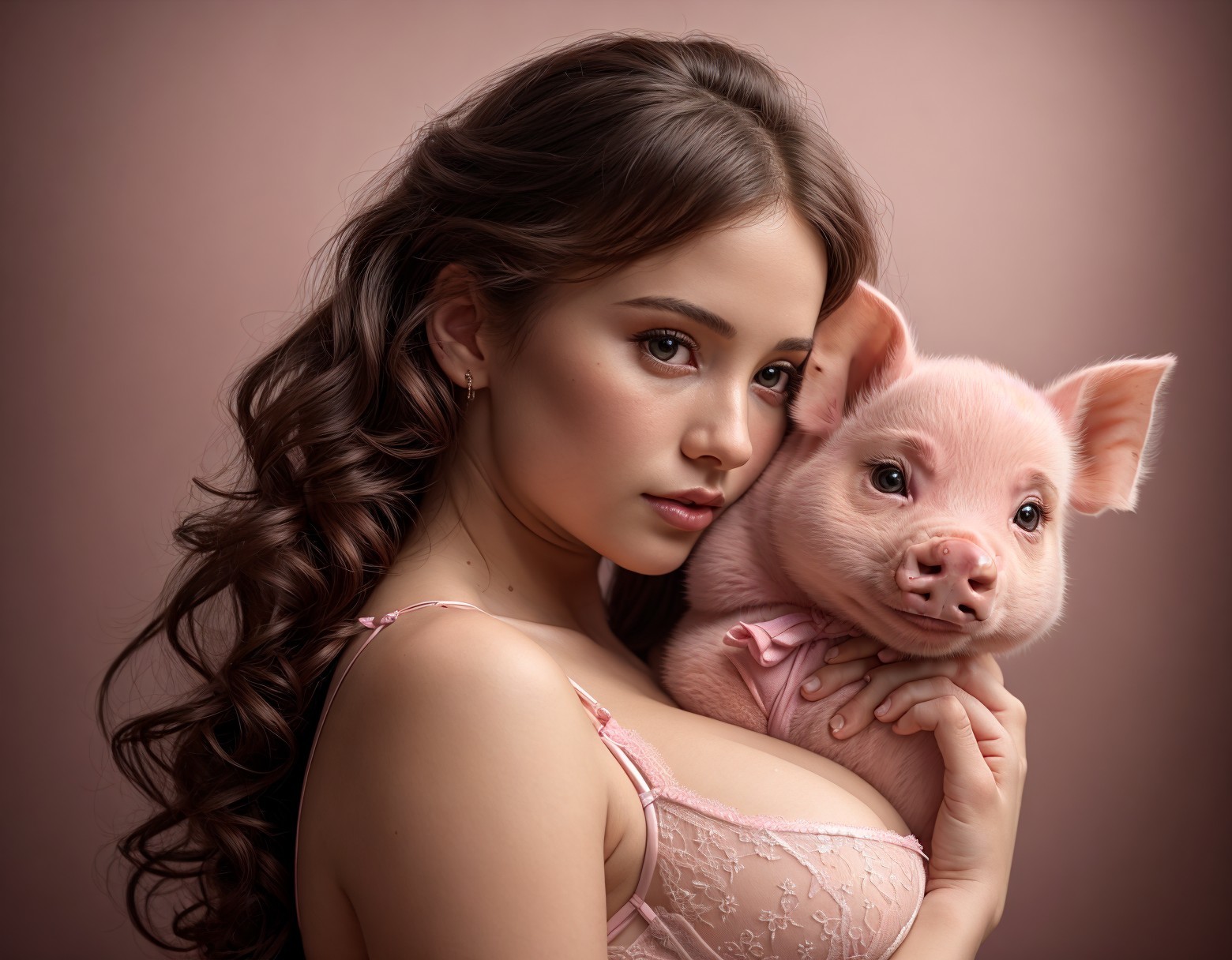 This was supposed to be a gorgeous young woman cuddling a very cute pink baby piglet in her arms.