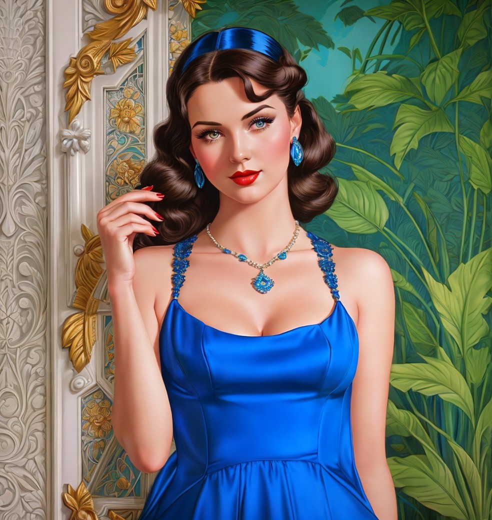+ Prompt:Brunette woman in a blue dress. Extremely detailed, badass vintage retro 3d glossy illustration, Art Noir/Art Deco/Art Nouveau/Comics Art/Fifties Style/Eighties Style.colors, striking detailed art style, outline, no text, lots of decoration.