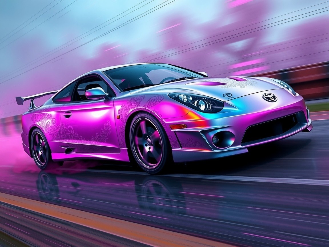 Prompt: "A 2001 Toyota Gen7 Celica TS, wrapped in a mesmerizing aluminum and latex membrane, speeds through a dreamlike environment with a vertical layout, as if defying gravity. Vibrant hues of neon pink, electric blue, and metallic silver dance across the car's body, evoking a sense of dynamic energy. Gothic whimsical elements, such as delicate filigree and ornate patterns, are intricately woven into the design, adding a touch of mystique. Emulsion lifts and optical glitch anomalies create a sense of visual tension, as if the image is shifting and morphing before our eyes. Inspired by the emotive styles of Hussar, Gray, and Beksinski, this illustration blends the surreal with the futuristic, resulting in a highly detailed, 8k resolution masterpiece reminiscent of Artstation's trending art. Analog errors and distortions add a layer of organic texture, grounding the image in a sense of reality."