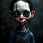 A whimsical yet melancholic character with large eyes, messy black hair, and a painted clown face. Dressed in a vintage clown outfit, they hold a small bouquet, exuding a sense of sadness.
