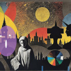 The image features a colorful, surreal mural blending abstract human silhouettes with vibrant celestial bodies. It juxtaposes faces with cosmic elements, creating a striking and thought-provoking composition.