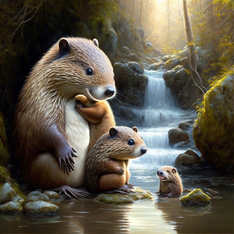 A family of beavers by a forest stream at dawn, with warm sunlight filtering through mist.