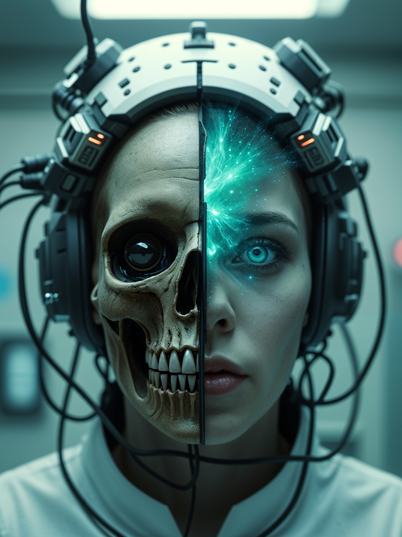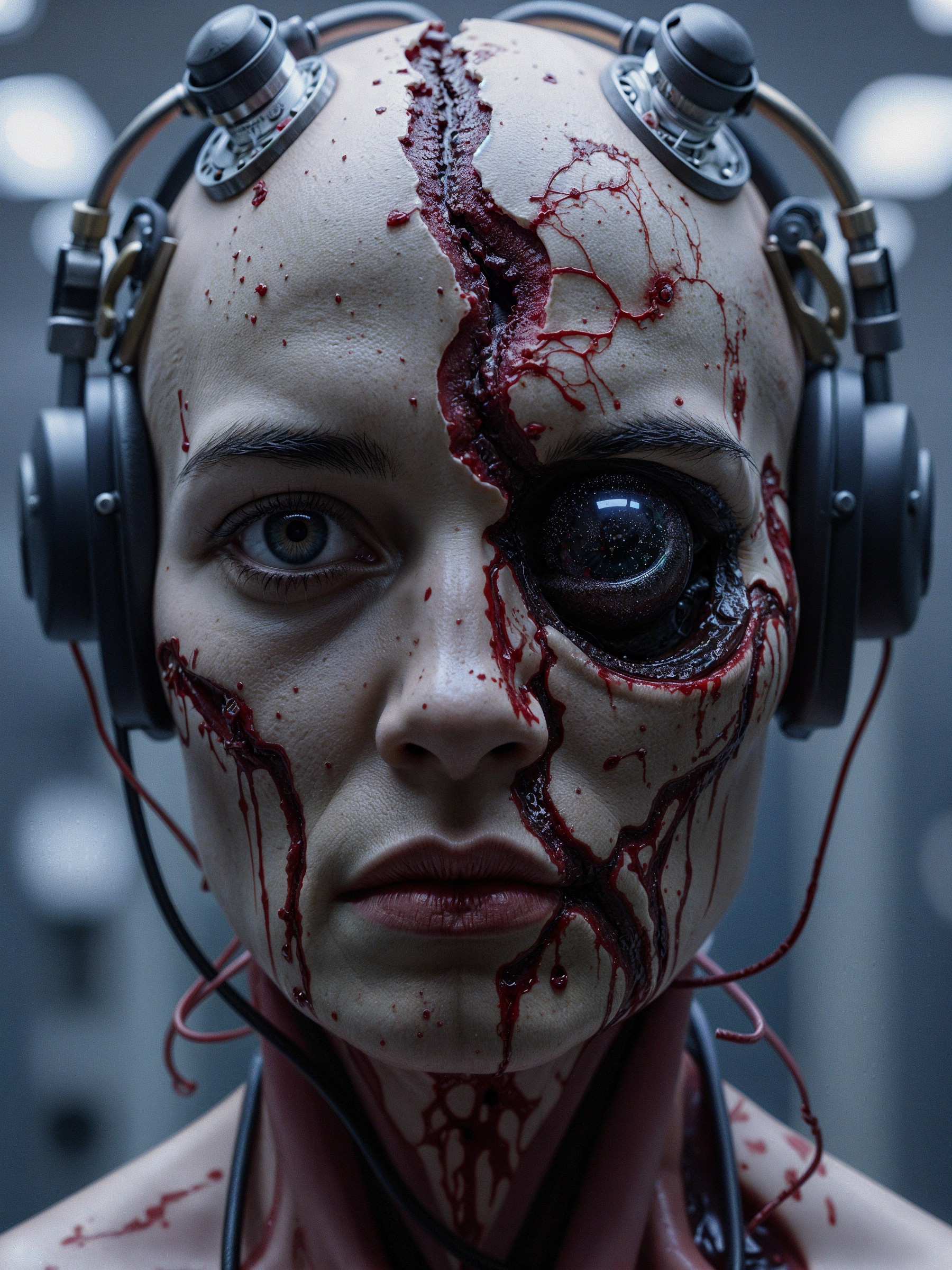 Prompt: "A hyper-realistic horror sci-fi portrait of a human subject in a grotesque medical experiment. A blood-soaked helmet with electrodes and wires is drilled deep into the scalp, puncture wounds oozing fresh blood. The face is violently torn apart down the center, jagged strips of flesh peeled back to expose raw muscle, torn veins, and glistening tissue. Strings of gore hang between the ripped halves of the face. Beneath the shredded skin, an alien skull emerges, its surface glowing faintly with a cosmic, galaxy-like texture. A single enormous, black, soulless eye stares out from the carnage. The human halves on each side look pale, lifeless, and mutilated — their lips cracked, their eyes dull and bloodshot. Blood splatters across the cold laboratory walls, wires slick with gore. The harsh, sterile lighting intensifies every detail — every drip, tear, and shredded nerve — creating an atmosphere of extreme, nightmarish body-horror. Photorealistic, ultra-detailed, graphic and disturbing horror sci-fi concept art."