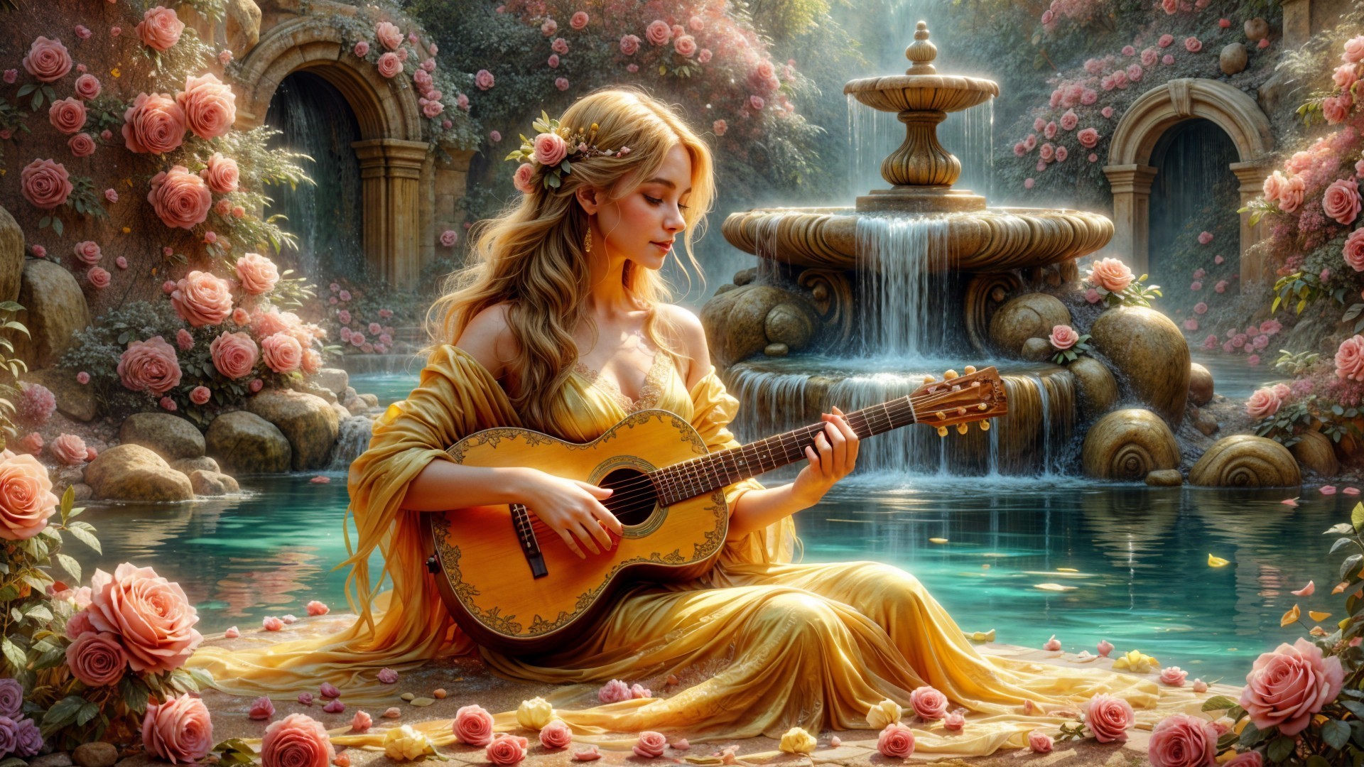 A serene scene features a woman in a flowing yellow gown, playing a guitar by a tranquil fountain surrounded by lush roses and gentle sunlight, creating a magical, enchanting atmosphere.