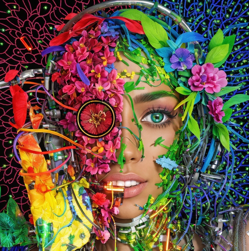 A surreal portrait of a person with a colourful floral headpiece intertwined with tech elements against a vibrant neon backdrop.