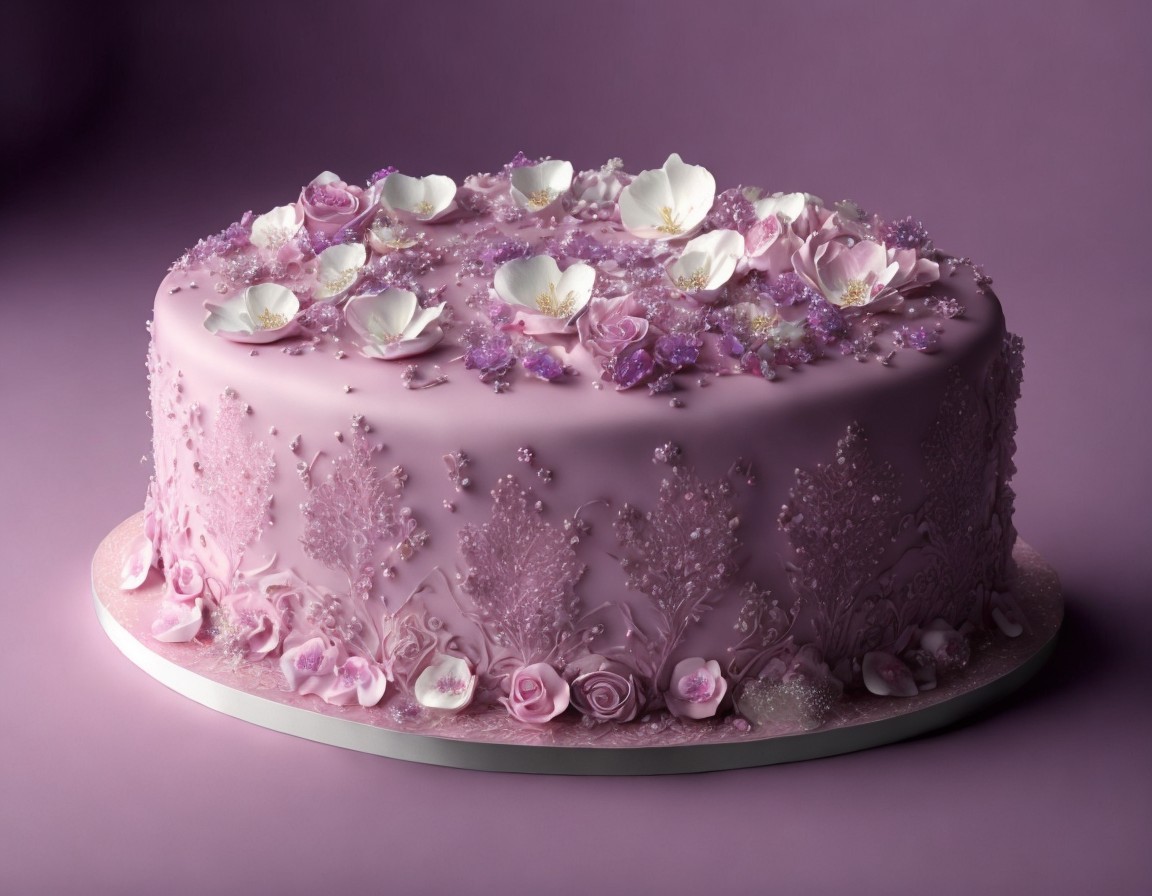 A beautifully crafted round cake in soft pink, adorned with delicate flowers and intricate sugar decorations. The elegant design features pearls and roses, creating a graceful centerpiece.