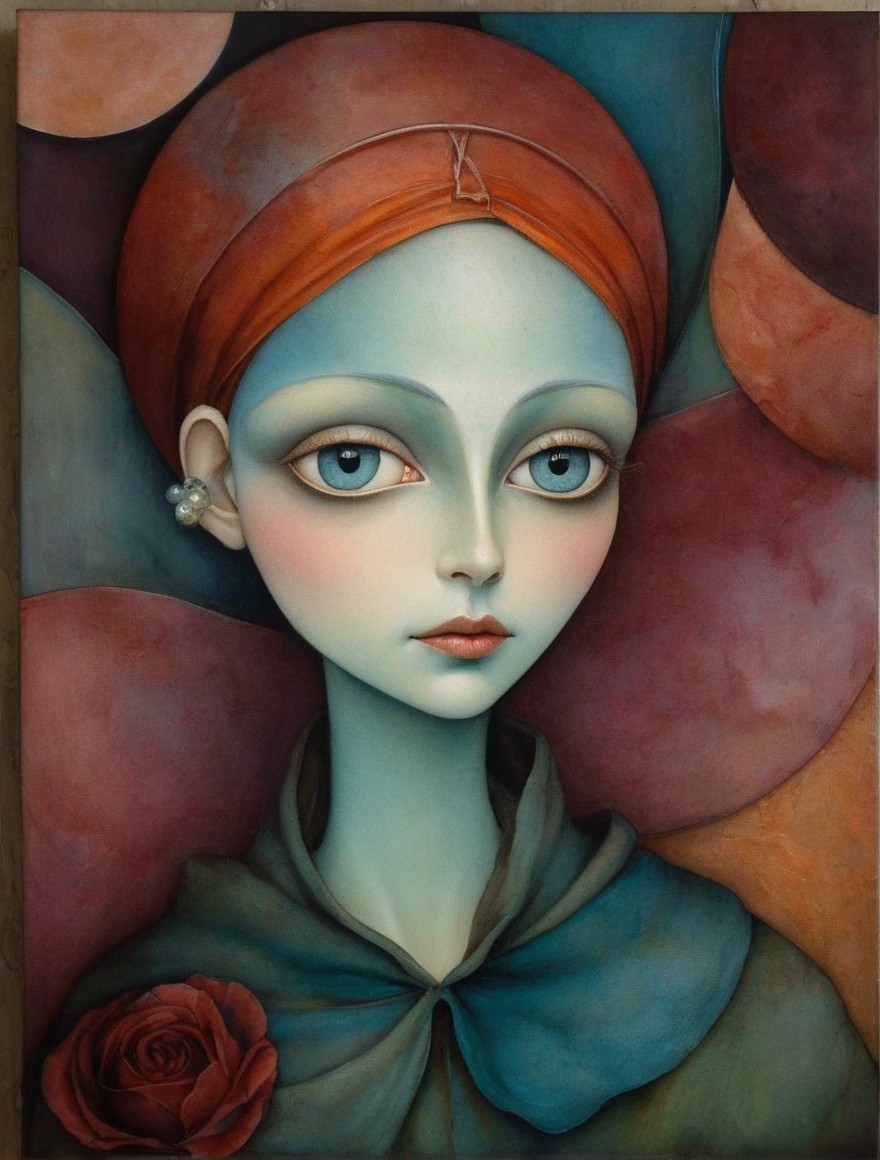 A painting depicting a fantasy female character with oversized pointed ears, blue skin, and a halo, styled in Renaissance fashion.