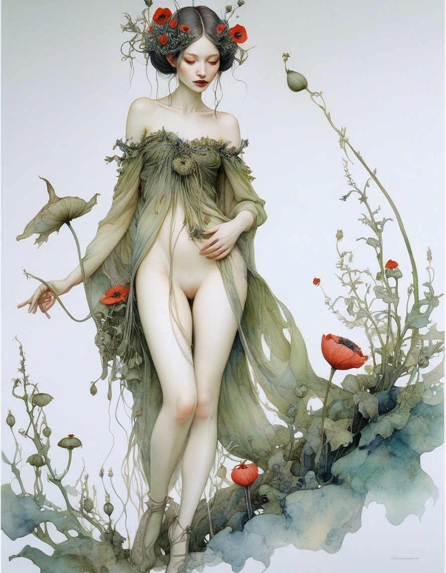 Prompt: Weirdly Creepy nymph with poppy flowers watercolor and ink, intricate, in the style of james jean, brian froud, zdzisław beksinski, hieronymus bosch, hyperdetailed, sharp focus, intricate concept art, digital painting, ambient lighting, 1 6 k, trending on artstation, hq, hyper quality