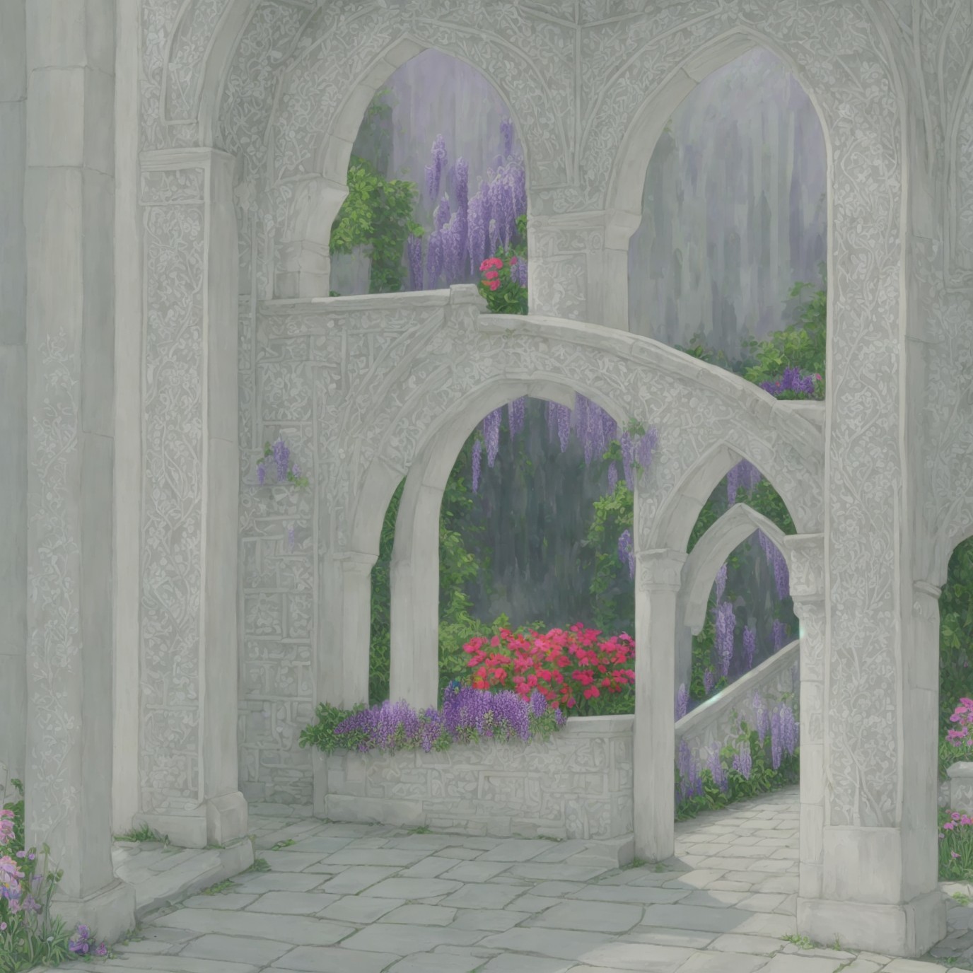 + Prompt:Aged archway with white etched stones, cobblestone path leading through long grass and wild flowers zentangle aesthetic, purple wisteria, strong harmonious colors