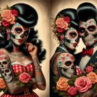 The image features a glamorous woman with dramatic makeup, featuring bold blue eyeshadow and striking red lips. Adorned with floral accessories and intricate jewelry, her style blends vintage and modern elements.
