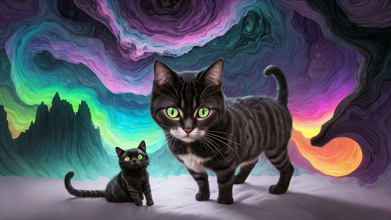 A vibrant, surreal scene featuring two cats—one large and striking with bright green eyes, and a smaller one, both set against a swirling, colorful cosmic background.