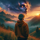 A person stands on a colorful path, gazing at a swirling sky filled with vibrant clouds and sunset hues. A serene landscape with rolling hills, trees, and lush flora surrounds them.