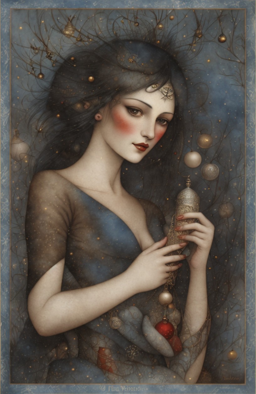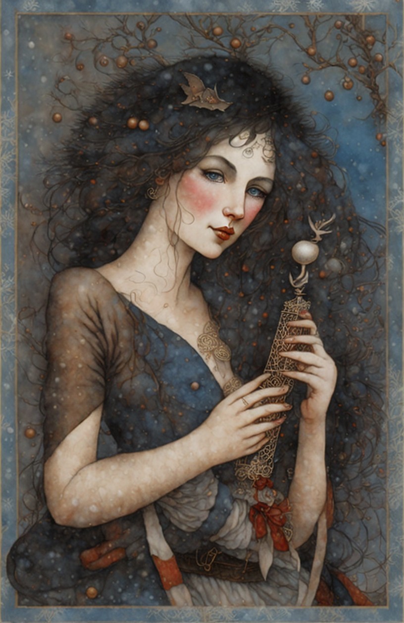 + Prompt:Illustrated By Kit Williams, Jamie Heiden, Daniel Merriam, Paul Klee, Karol Bak, Salvador Dali, extremely detailed, high definition, crisp quality, ultra detailed background Parisian Christmas enchantress.