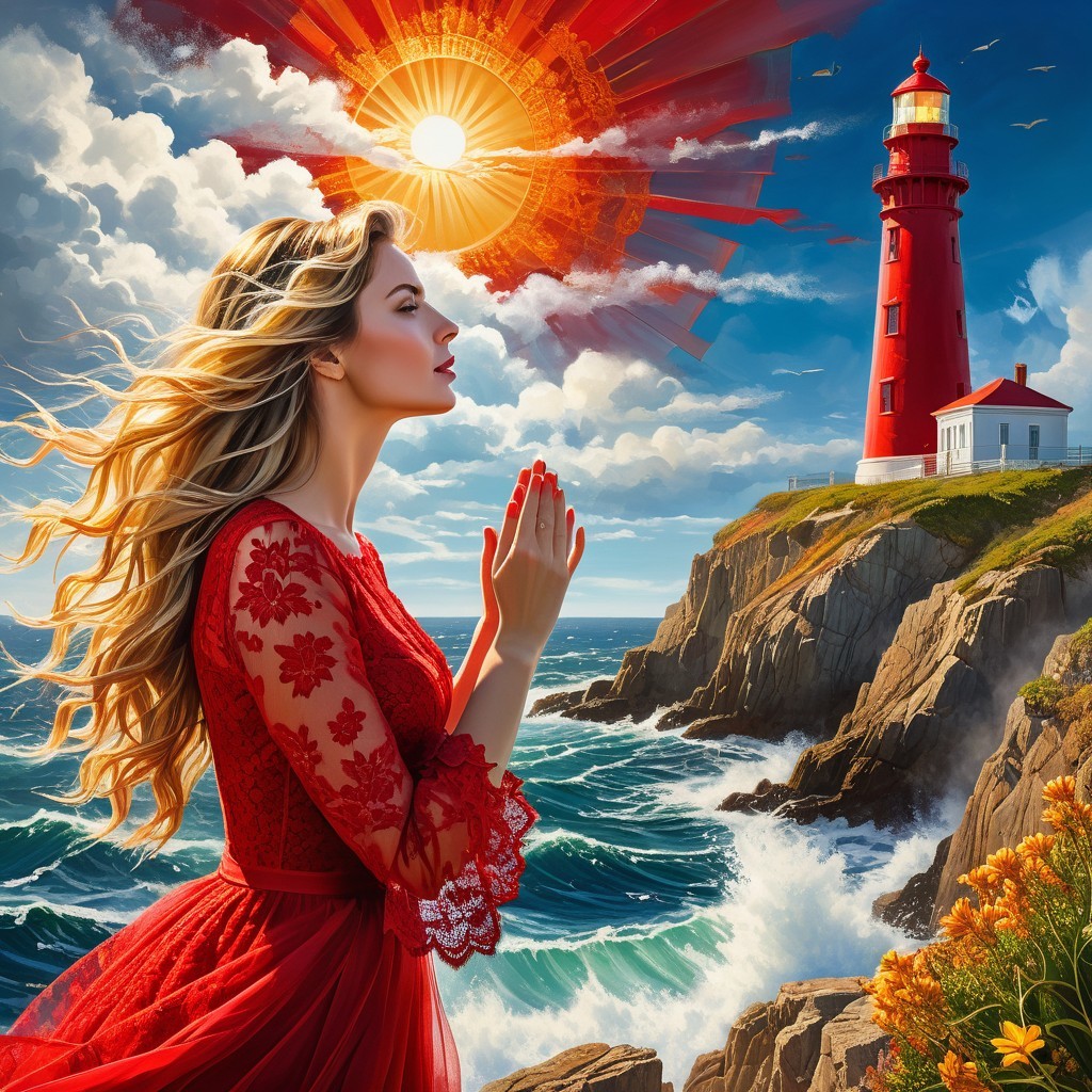 A serene woman in a flowing orange dress prays by the ocean, with a vibrant lighthouse in the background and golden sunlight illuminating the scene, creating a peaceful, spiritual atmosphere.