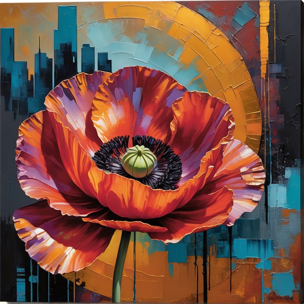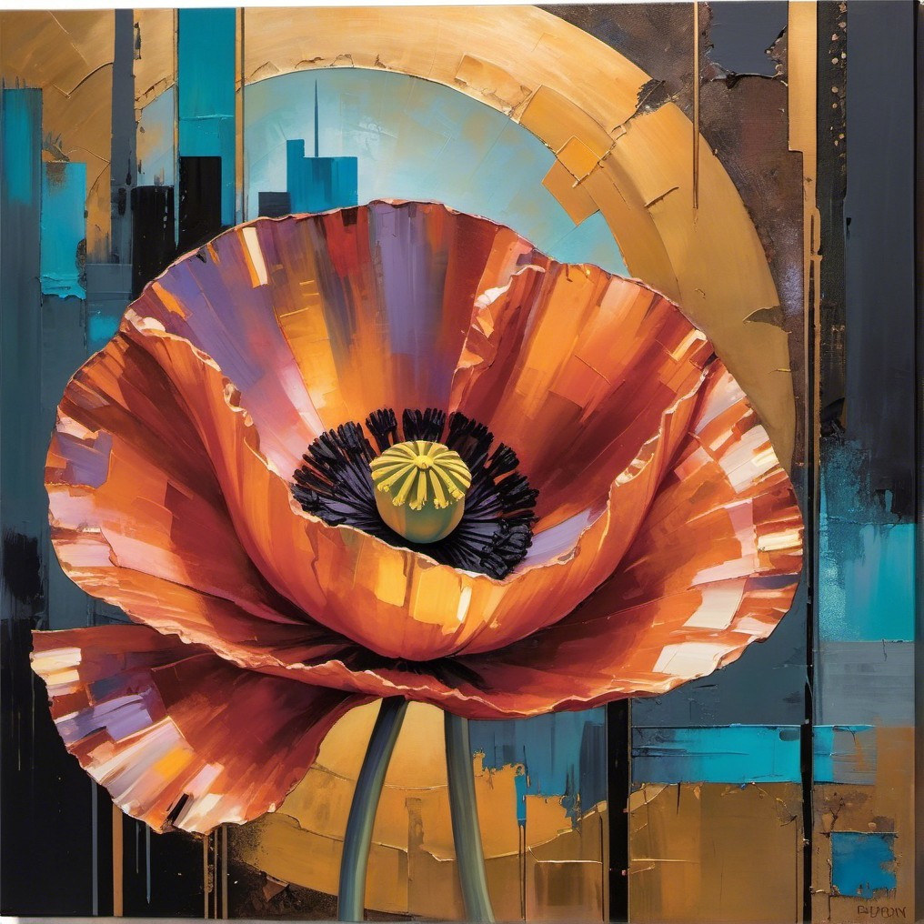 Prompt: "The artwork presents a close-up abstract portrait centered on a red Poppy, characterized by layered textures and fragmented elements, harmonizing iridescent color tones. The composition incorporates a distressed background with skyline and vertical streaks and metallic accents, evoking an industrial aesthetic and enhancing depth and contrast. Great golden sunset. This piece establishes a mysterious and evocative atmosphere, skillfully blending modern abstract art with zen art."