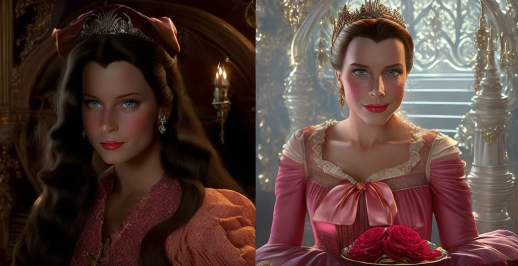 Split 3D animation: woman in red dress & tiara in fairy-tale vs. realistic