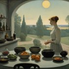 A young woman delicately arranges a bouquet of colorful flowers in a sunlit room, surrounded by pottery and fresh fruit, creating a serene and cozy atmosphere.