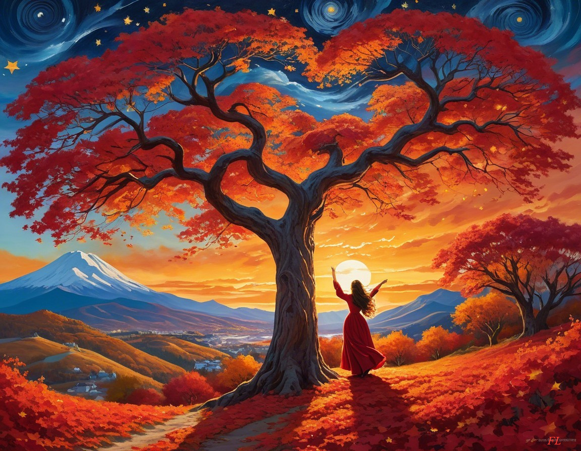 A stunning landscape features a vibrant tree with red leaves under a starry sky. A woman in a flowing red dress stands beside the tree, embracing a glowing sunset, with mountains in the background.