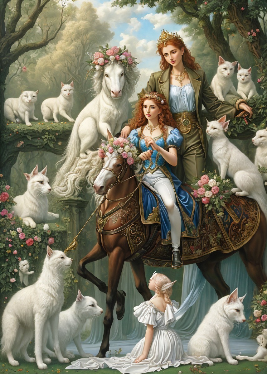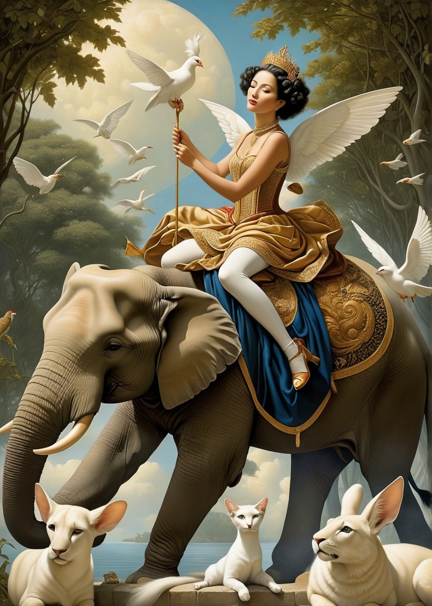 A graceful woman with wings wears a golden dress, sitting atop an elephant amidst clouds. She holds a mirror, with a full moon and birds creating a dreamlike atmosphere.