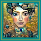 A vibrant, stylized portrait of a woman with striking green eyes and curly hair, emerging from a calm, colorful landscape featuring small boats on reflective water.
