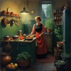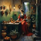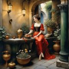 A graceful woman in a flowing red gown sits in a sunlit courtyard, surrounded by vibrant flowers and stone architecture, while a colorful parrot watches her from a nearby ledge.