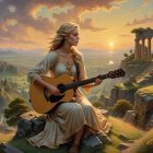 A serene landscape at sunset features a young woman in a flowing dress, playing guitar among vibrant flowers, with mountains and a classical structure in the background, evoking tranquility.