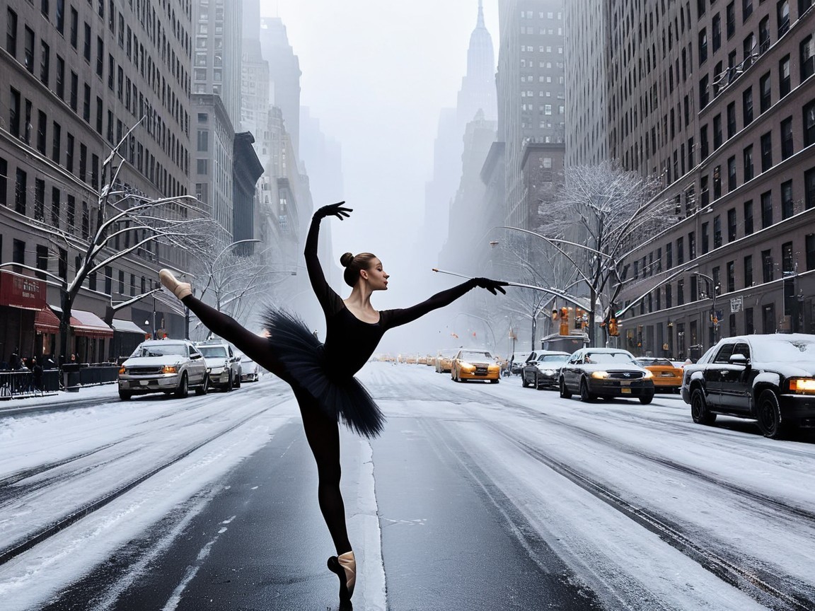 A ballerina in a black tutu poses gracefully on a snow-covered city street, with tall buildings and a snowy landscape creating a serene winter urban backdrop.