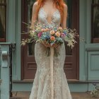 A stunning bride stands on steps with a graceful gown featuring delicate lace details. She holds a vibrant bouquet of flowers in shades of blue, orange, and green against a charming backdrop.