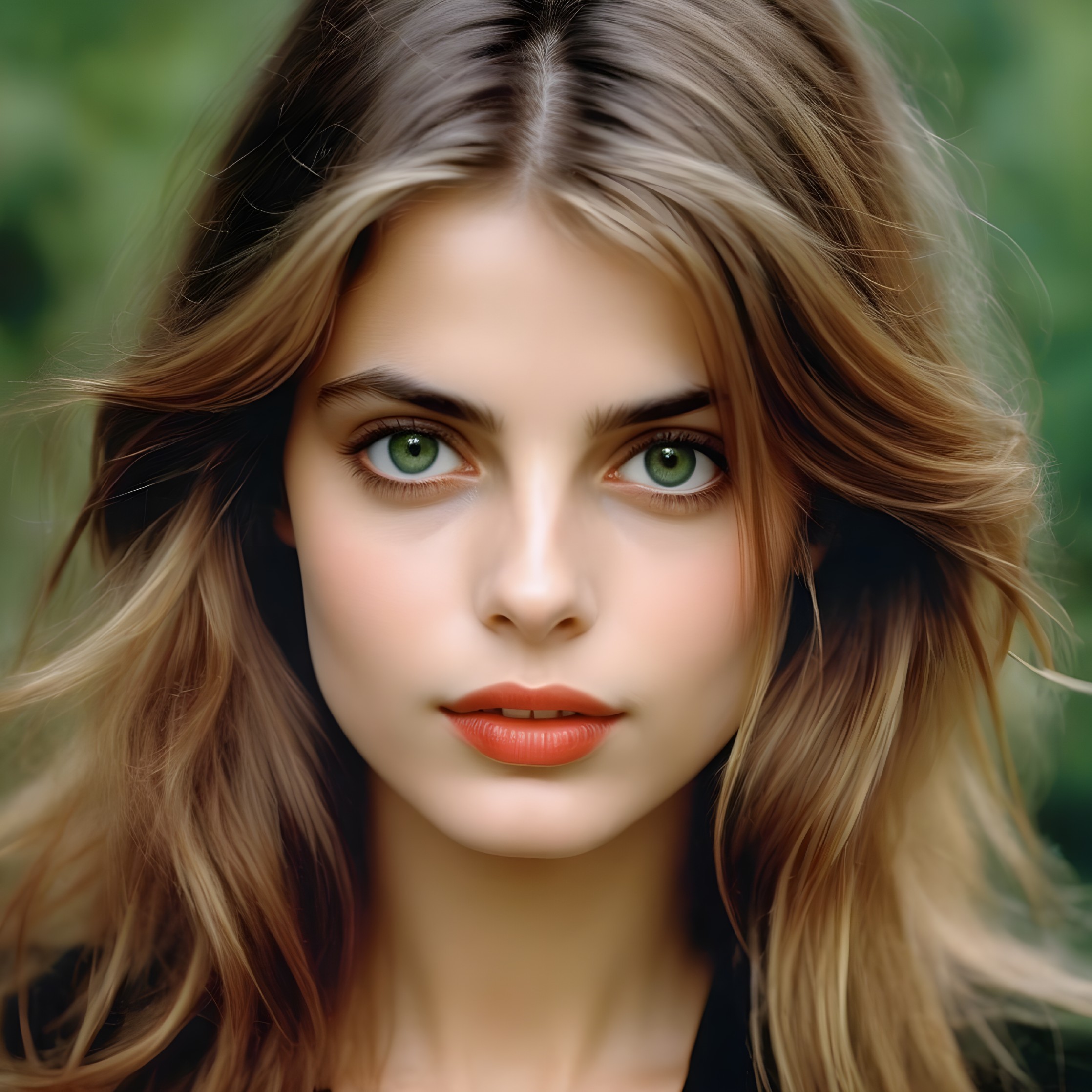 A close-up of a young woman with long, wavy hair. She has striking green eyes and soft, natural makeup, featuring a hint of red lipstick against a blurred green background.