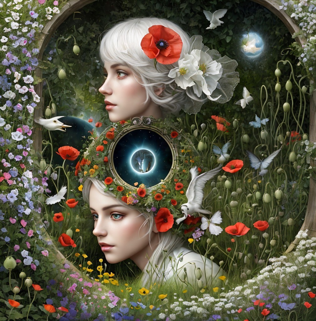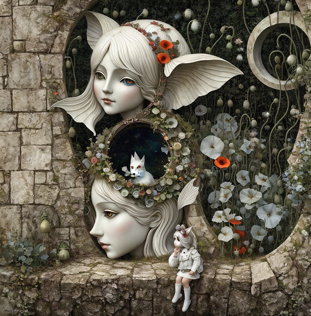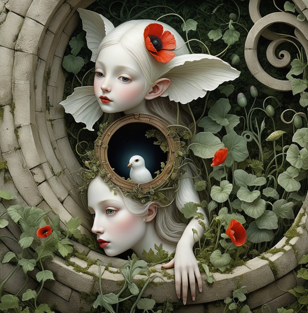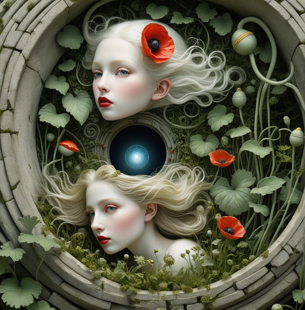 Close up, wild child of the poppy gorgeous white face creature staring into a portal in a garden maze, in the style of Alexander Jansson. by Catrin Welz-Stein, Michael Parkes. By Rob Gonsalves, Markus Pierson