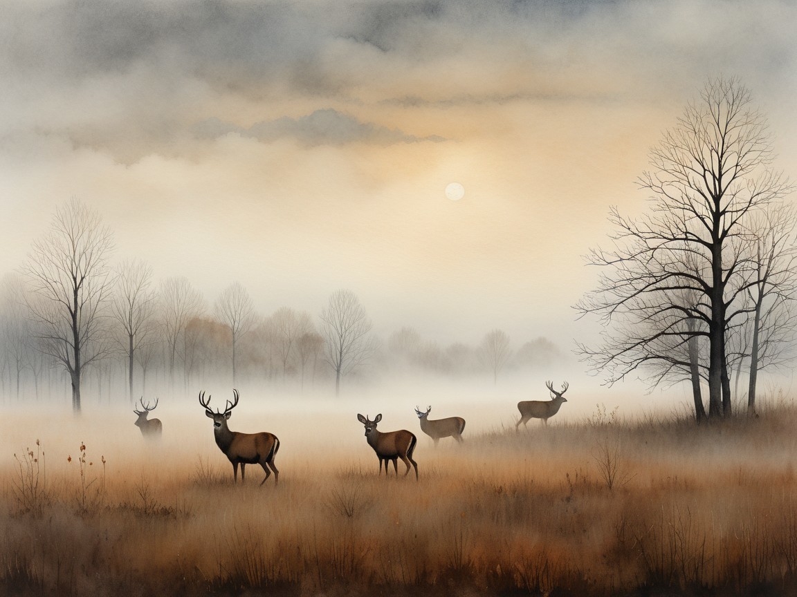 Prompt: "Deers in a vast, lonely landscape, soft, fading edges, cloudy, foggy, graying, falling multicolored leaves, faint sunlight behind clouds of fog, wet watercolor, intricate, soft, serene, stylization with brown lines, in the style of Jamie Heiden"