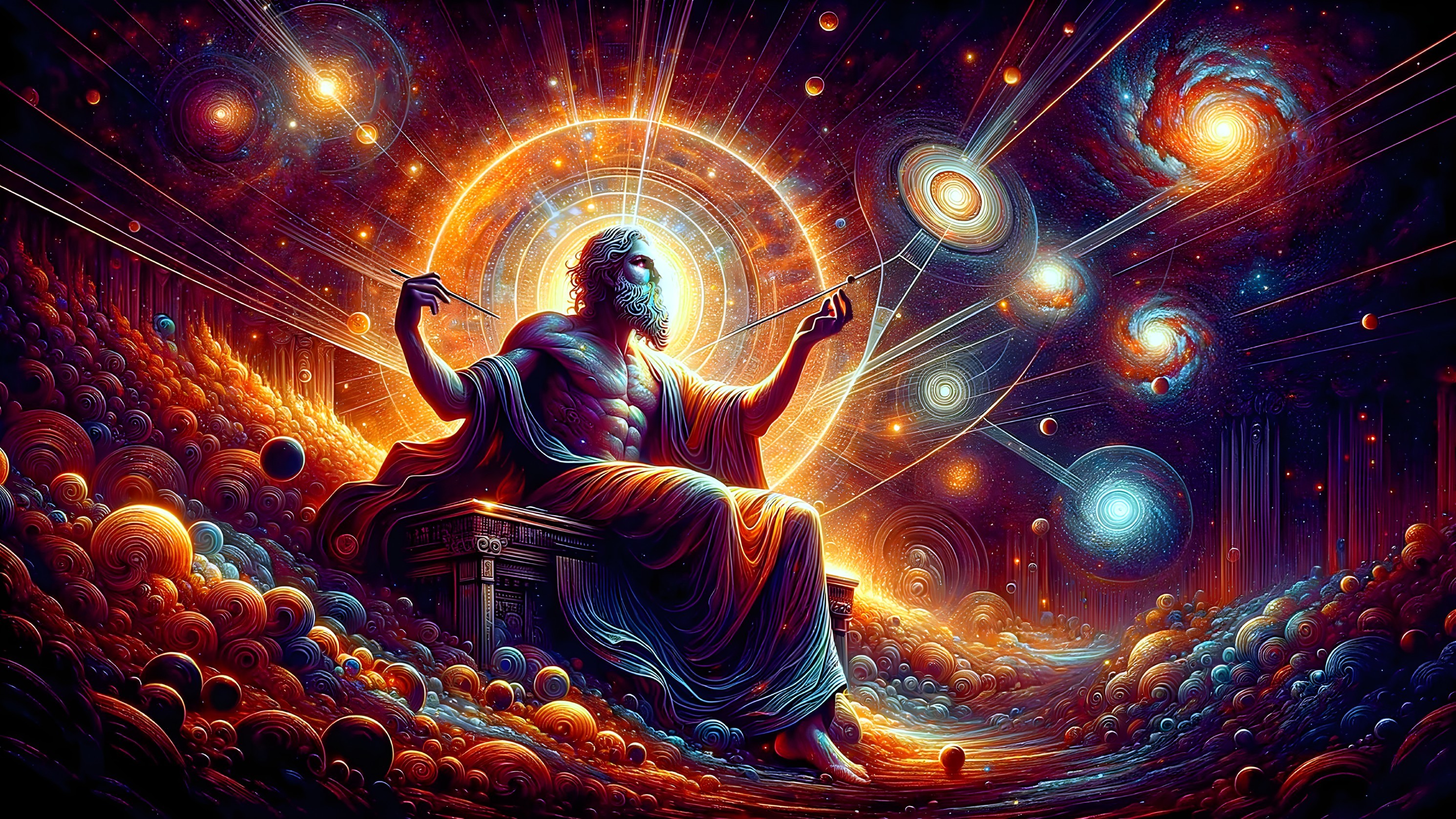 A stunning and intricate artwork depicting a brooding deity creating the universe in hyperrealistic detail. The elegant piece features dynamic lighting, surreal elements, and a golden ratio composition, with a crisp quality that resembles a cinematic postprocessing effect.