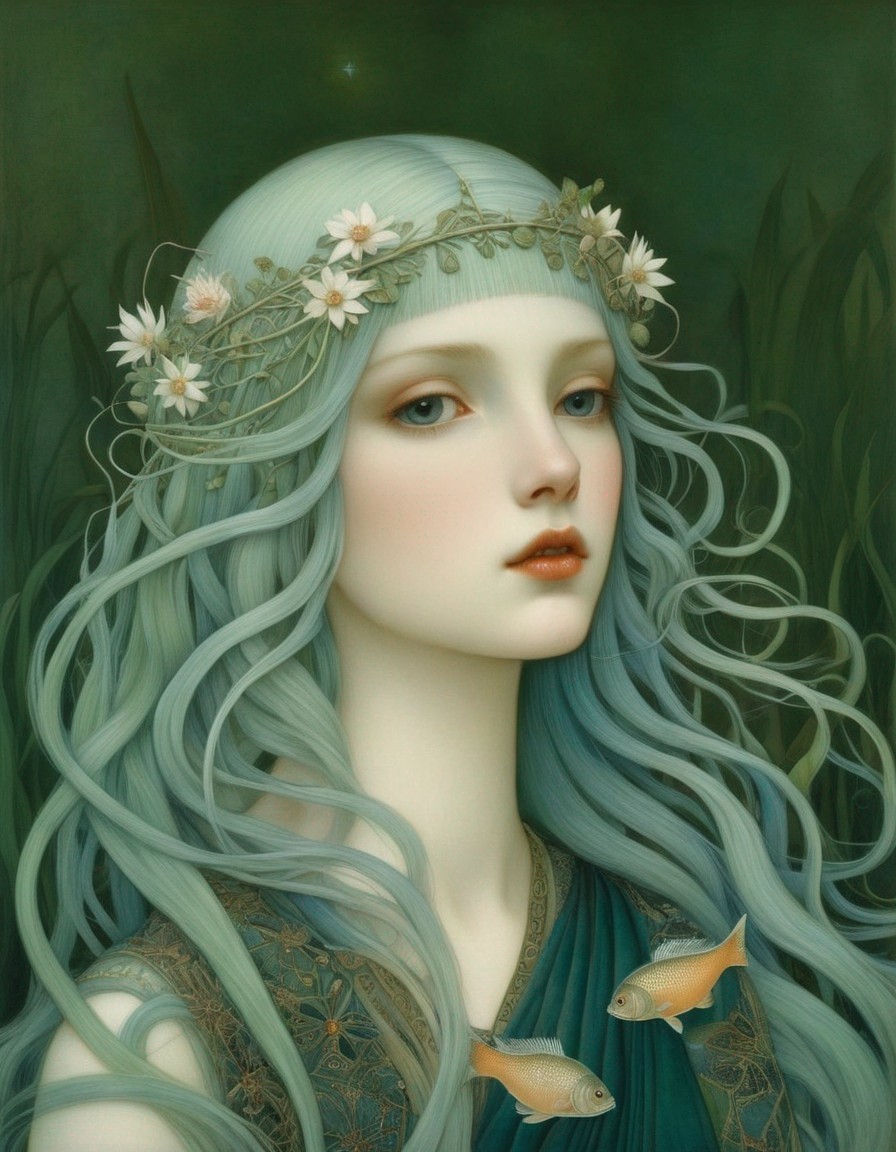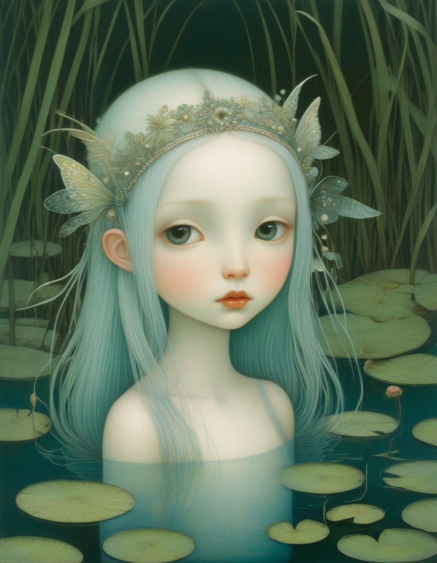 Pale character with white hair and floral ornaments, alongside reeds and butterfly.