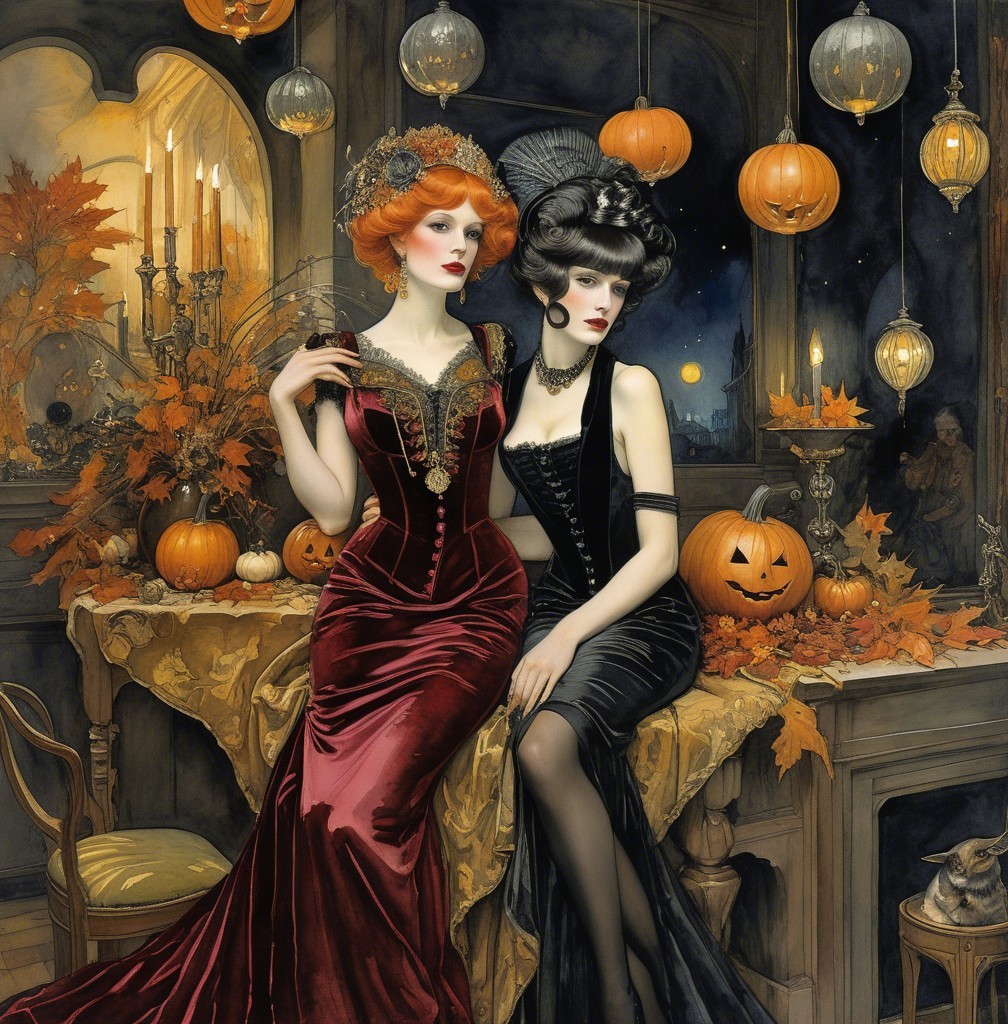 Two elegantly dressed women in red and black gowns stand beside a table adorned with pumpkins and autumn leaves, set in a dimly lit room with warm candlelight and Halloween decor.