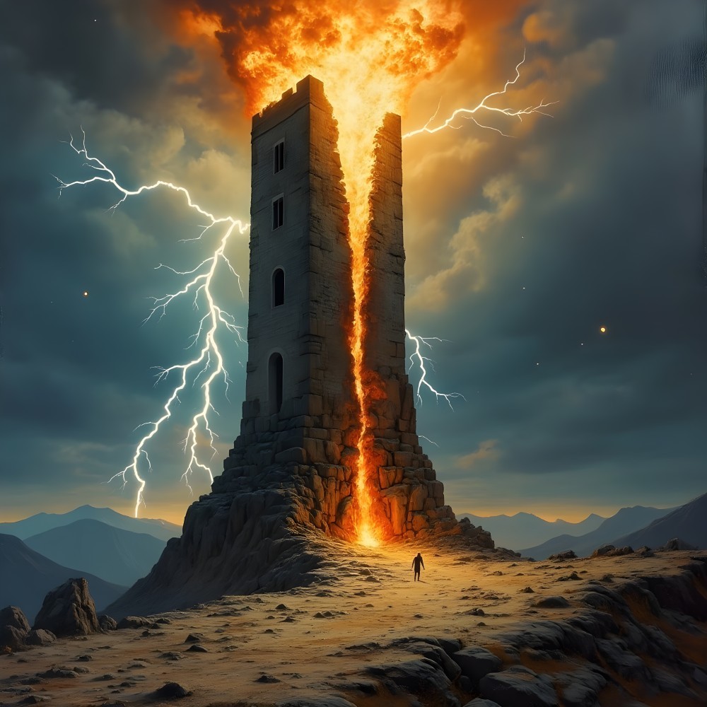 A towering, ancient structure split by a fiery eruption, engulfed in flames and lightning. A lone figure stands before it, silhouetted against a dramatic, stormy sky and rugged mountains.