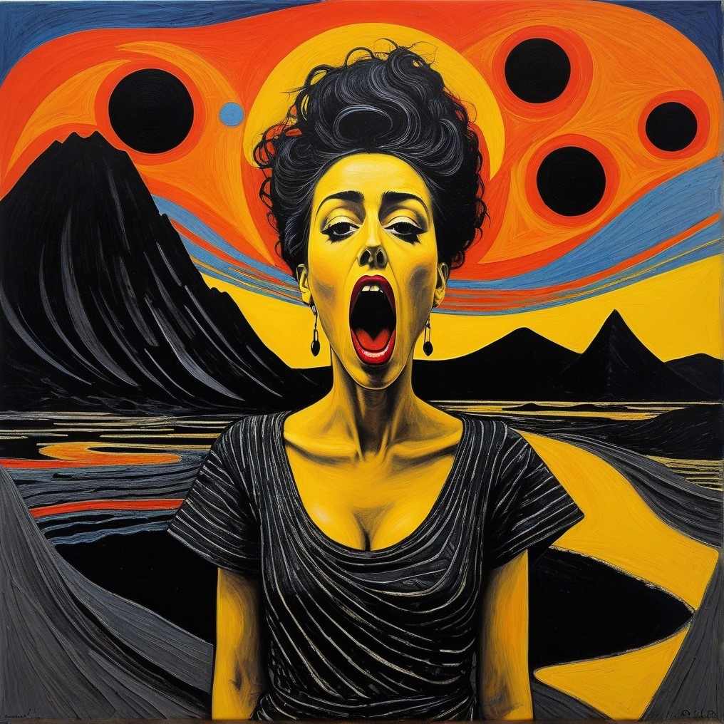 A woman stands at the center of a cosmic storm, her mouth open in a silent scream. The bold yellows, blacks, and reds swirl in a surreal volcanic landscape, where celestial bodies loom overhead. The fusion of raw emotion and an eerie stillness creates a powerful visual paradox of sound and silence.