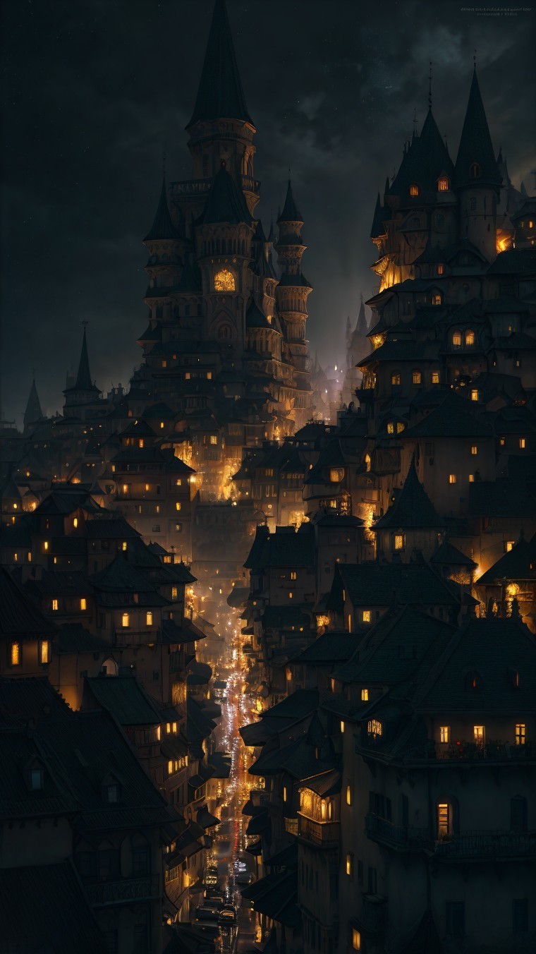 Fantasy medieval cityscape at night with glowing windows and grand cathedral.
