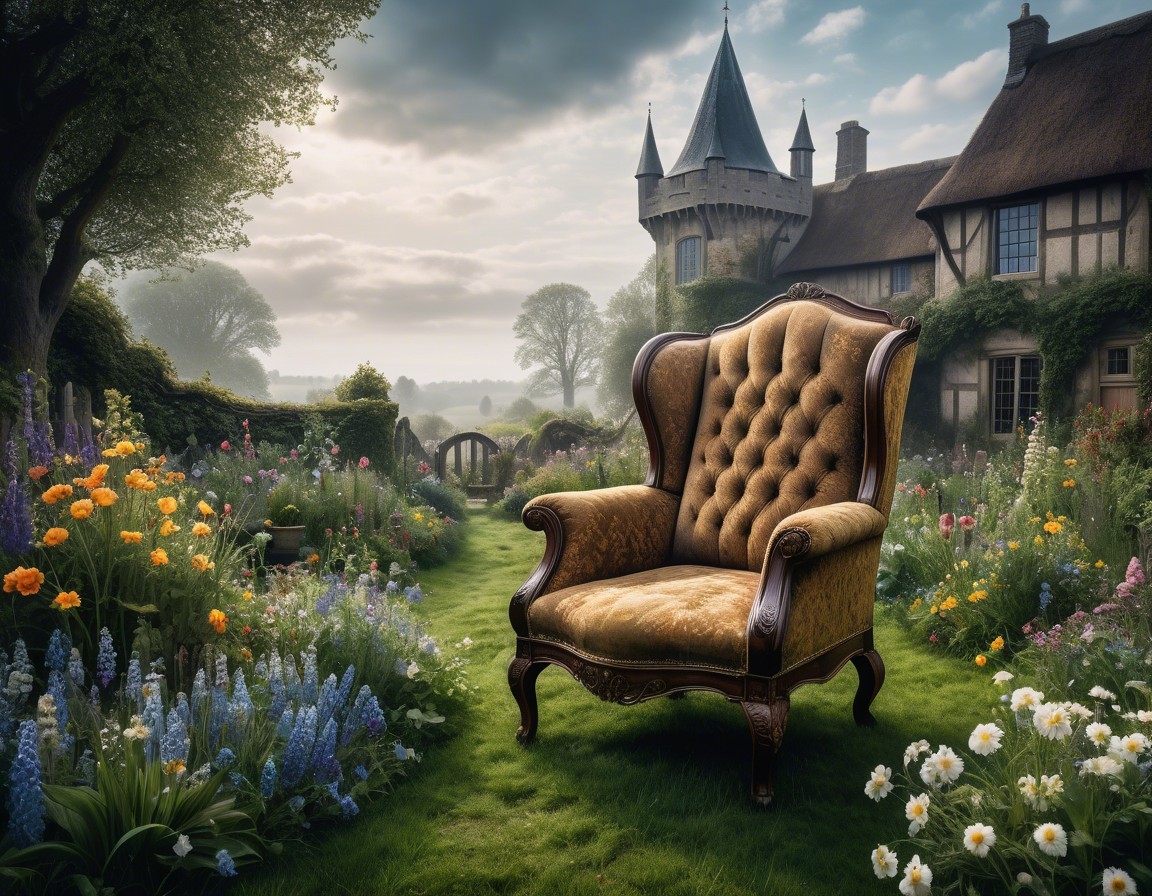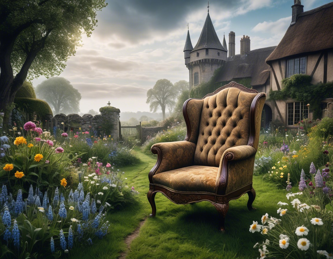 A vintage, tufted armchair sits in a vibrant flower garden, with a charming cottage and castle in the background, bathed in soft, warm sunlight under a serene sky.