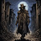 A mysterious figure called "Scarcrow" with a skull mask and tattered coat strides down a desolate street beneath a full moon. Dilapidated buildings flank the path, creating an eerie, haunting atmosphere.