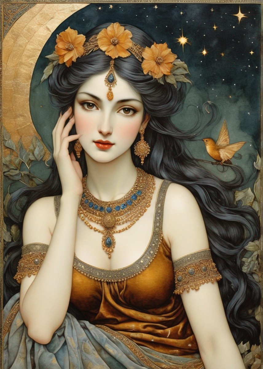 + Prompt:Nymph of the night is dark and full of beautiful magic. 3rd century Persian miniature art, golden ochre, sage green, pearl grey, paprika, blue-grey, Velvet Black, Shabby, Dull Gold, Amber Gray, Golden Ratio, Surreal Fantasy, Elegant, High Definition Ultra Fine 3D Line, Zenangle Style, Watercolor Patchwork , Arthur Rackham Style, Paul Kidby, , Jacek yerka, Extremely Detailed, Intricate, Thoughtful, HDR, Fractal, Beautiful, Award Winning, Fantasy Look, Fantasy, Crisp Quality