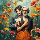 A whimsical painting featuring a young woman and an elderly man amidst vibrant flowers. They hold playing cards, with bright colors blending together to create a lively and enchanting atmosphere.