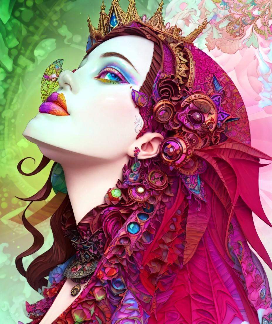 +3d paper cutting, beautiful pale face with coronet, beautiful garments, maximalism, flamboyant details, geometrical art, 3d cuttings, saturated colors, triadic color scheme red reddish-brown mimosa, trippy art, highly detailed strokes, deep cuts, plushy psychpomp, tints of steampunk, highlighted iridescence, echaustic lines, plasticity, luminous iridescence, acid spill,( embossed ink flow,( beautiful anthropomorphic shape , tints of zentangle style)7:4), deep texture patchwork, ornamental details, beads, pearls, rhinestones ornate, maximalism, biomorphic details, volumetric lighting, extremely smooth crackles, detailed watercolor inkpunk illustration