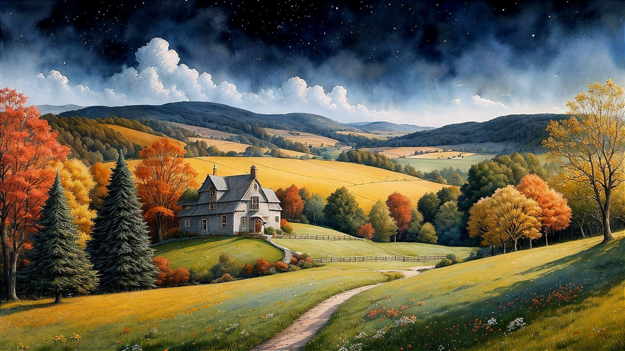 A serene countryside scene features a quaint stone house surrounded by vibrant autumn trees. Rolling hills and a clear sky create a peaceful, picturesque landscape bathed in warm hues.