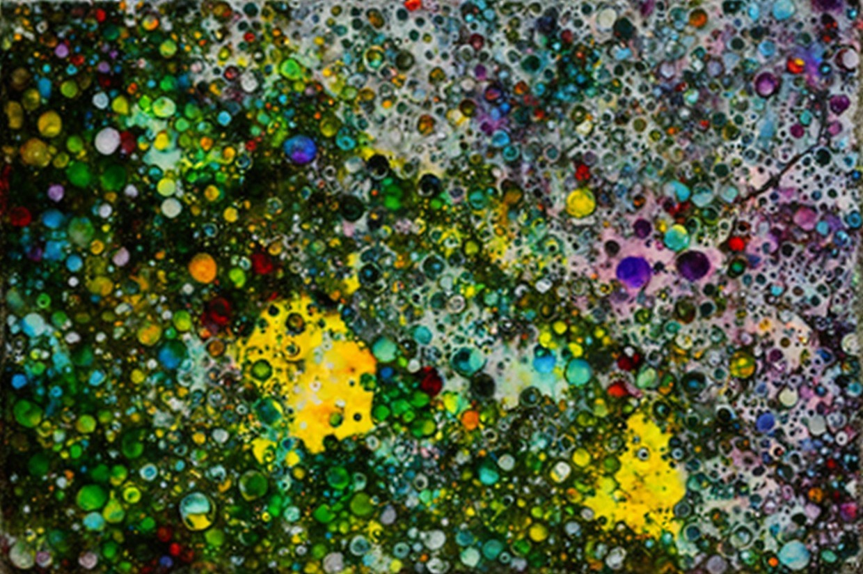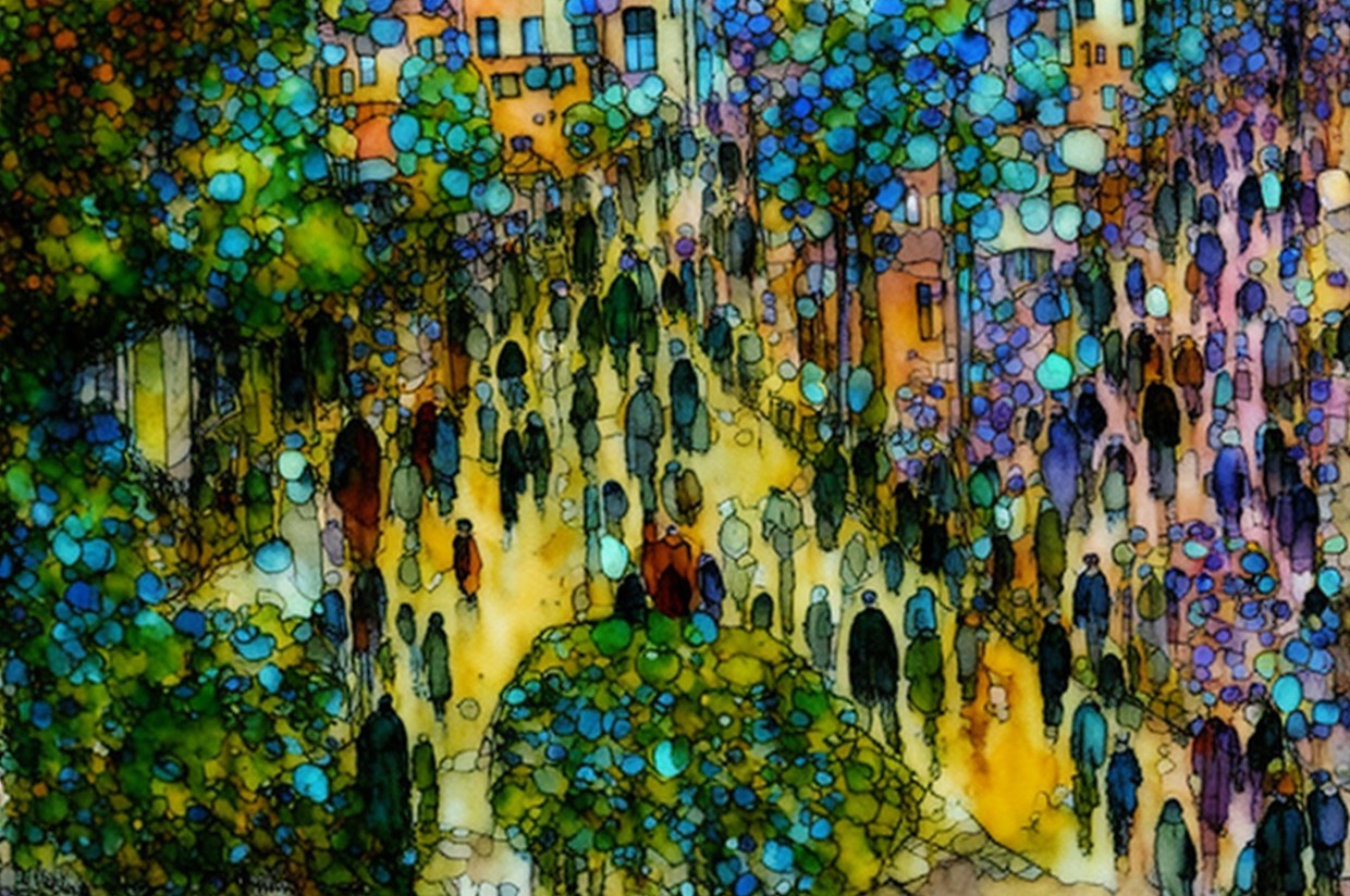 A vibrant, impressionistic scene of a bustling city street at dusk. People wander among lush greenery and lampposts, with warm lights illuminating the charming architecture and lively atmosphere.