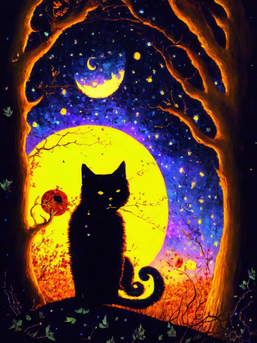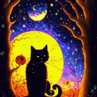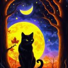 Black Cat in Mystical Twilight Forest Under Full Moon