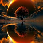 A stunning landscape features a serene lake reflecting vibrant colors of a sunset and a massive, glowing planet in the sky. Lush trees line the shore, creating a tranquil, otherworldly scene.